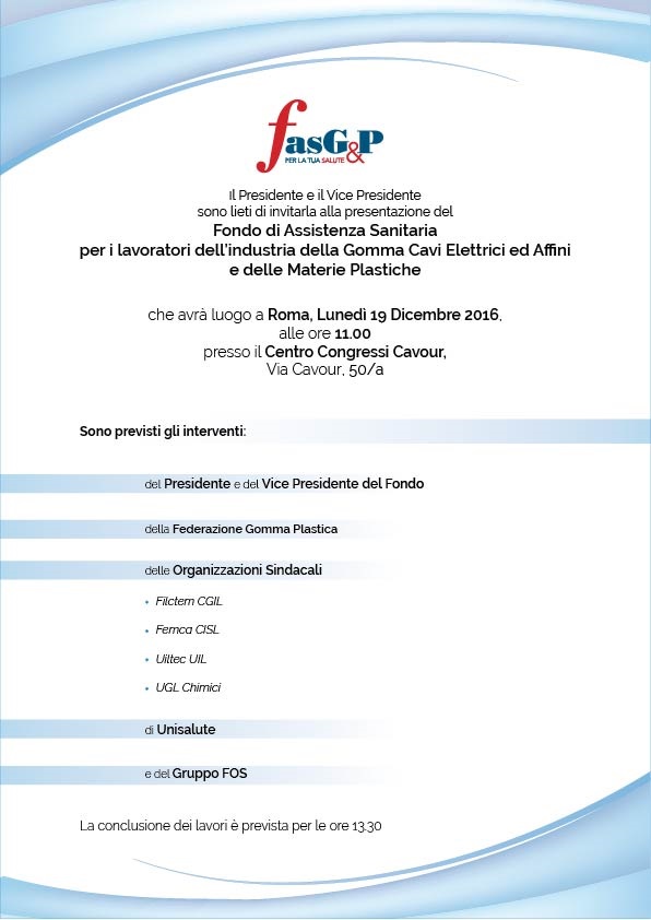FasG&P, Fondo di assistenza sanitaria integrativa per il settore dell'industria della gomma cavi elettrici ed affini e dell'industria delle materie plastiche, organizza, Lunedì 19 Dicembre p.v. alle ore 11.00 a Roma, la presentazione del Fondo.
