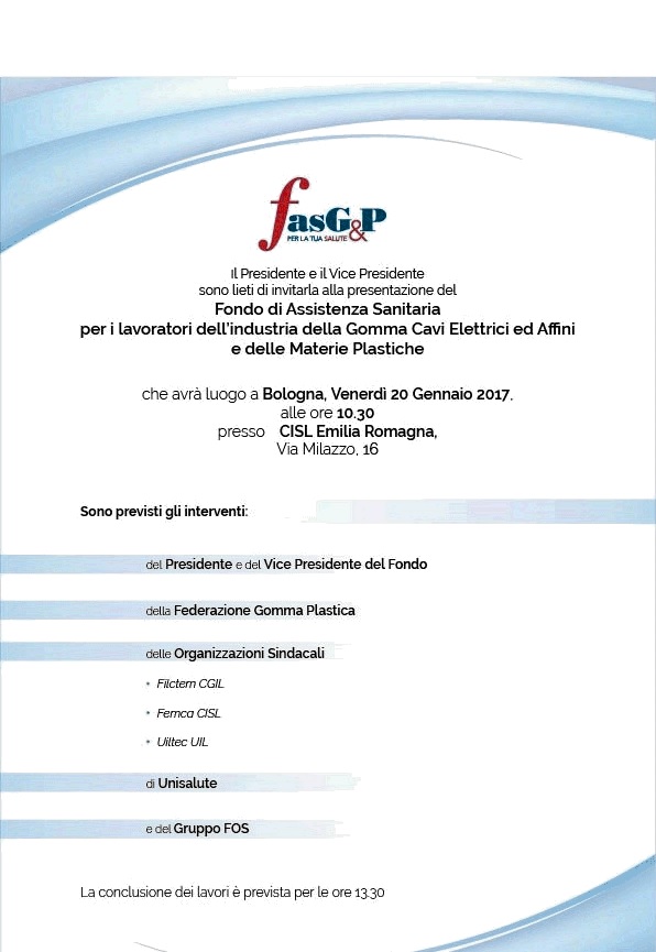 FasG&P, Fondo di assistenza sanitaria integrativa per il settore dell'industria della gomma cavi elettrici ed affini e dell'industria delle materie plastiche, organizza, Venerdì 20 Gennaio p.v. alle ore 10.30 a Bologna, la presentazione del Fondo.