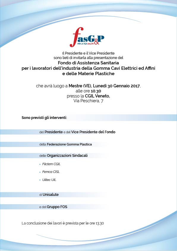 FasG&P, Fondo di assistenza sanitaria integrativa per il settore dell'industria della gomma cavi elettrici ed affini e dell'industria delle materie plastiche, organizza, lunedì 30 Gennaio p.v. alle ore 10.30 a Mestre, la presentazione del Fondo.
